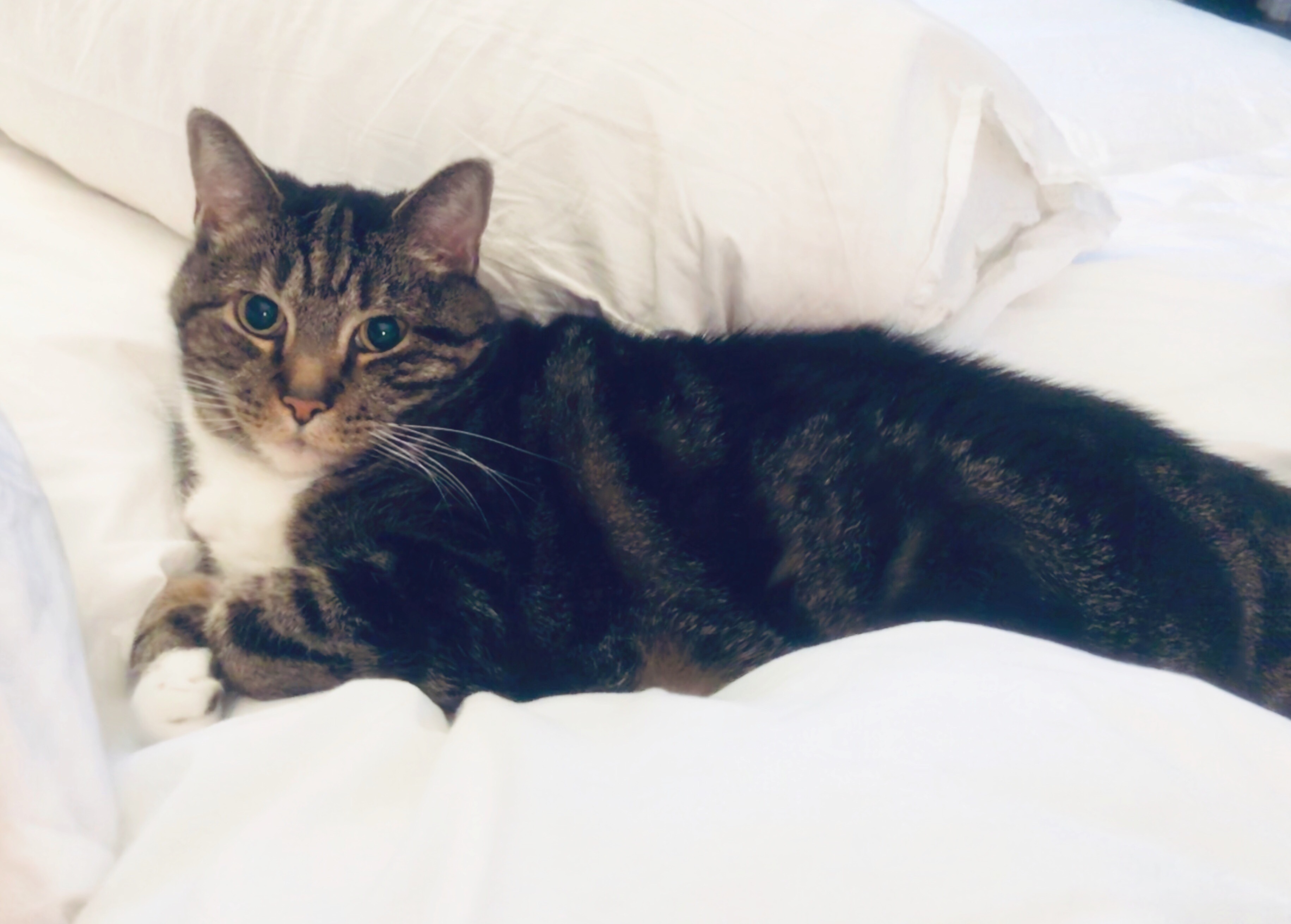 This 15lb (!) adorable baby followed me home when he was just a tiny kitten. He wouldn't leave the porch so I resigned myself to the fact that he lived with me. That was fourteen years ago. We've been best buds since.